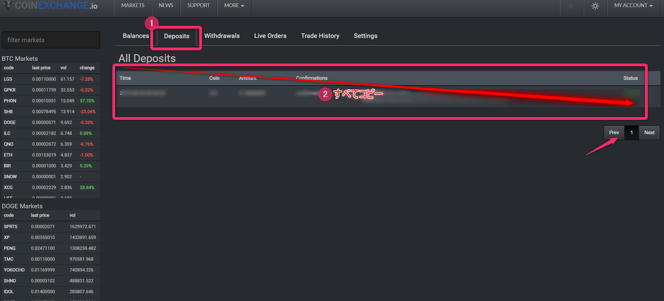 画面上に、預入履歴(ALL Depodits)が表示されるので、②「Time」から「Status」までのヘッダーを含めた、すべての履歴をコピーしてください。