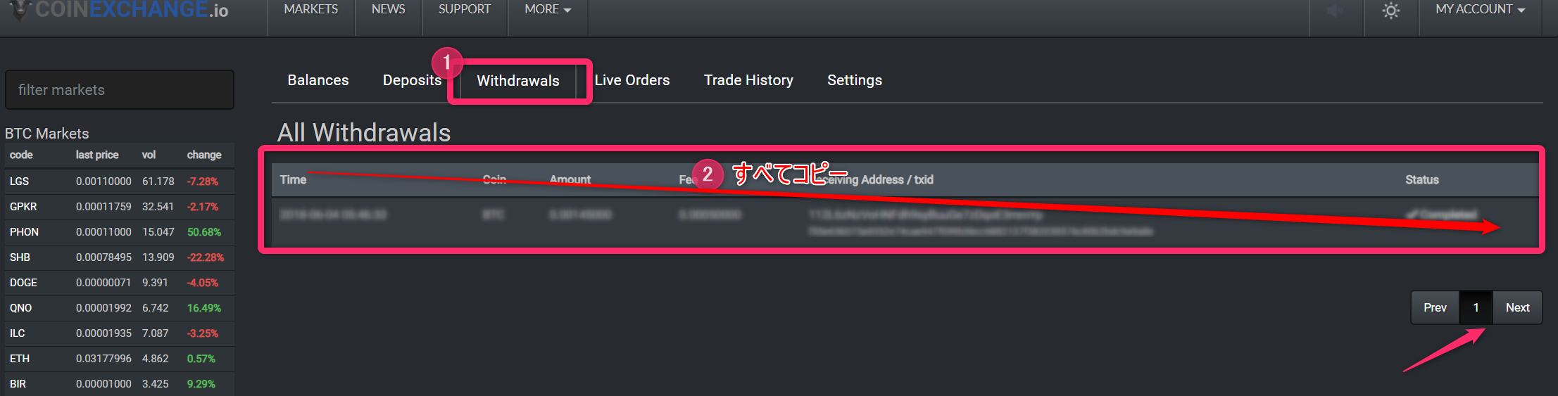 画面上に、送付履歴(ALL Withdrawals)が表示されるので、②「Time」から「Status」までのヘッダーを含めた、すべての履歴をコピーしてください。