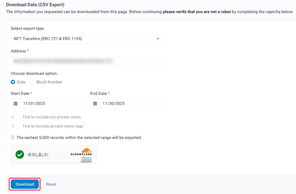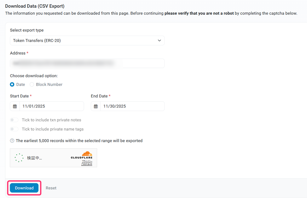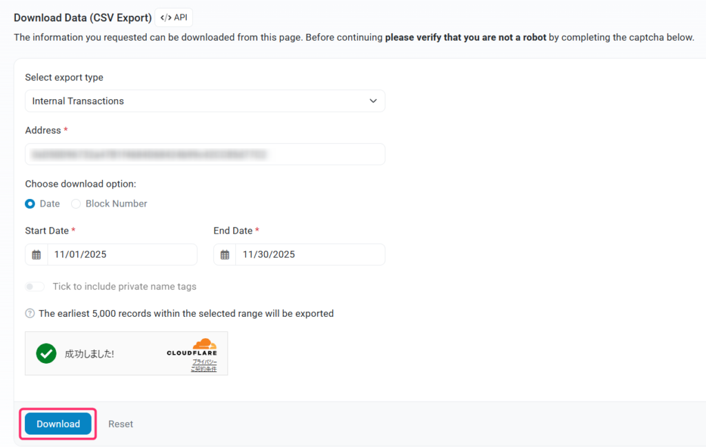 すると以下のような画面が表示されるので、期間を指定して「Download」をクリックしたら完了です。
