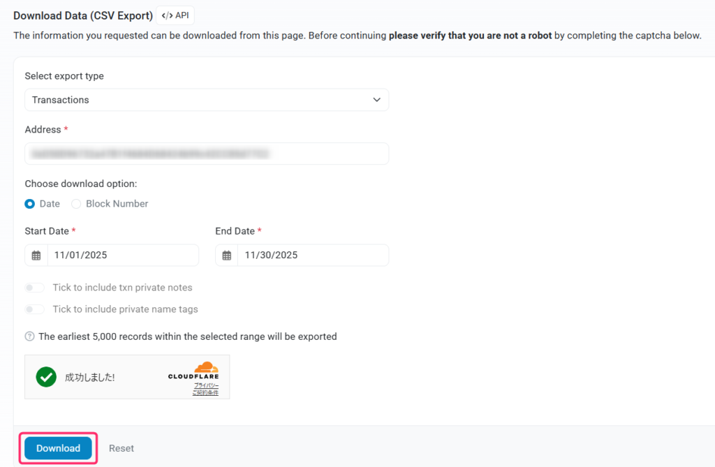 一つのファイルに記載される件数の上限が5,000件のため、5,000件以上の取引がある方は、期間を絞って分割してダウンロードしてください。