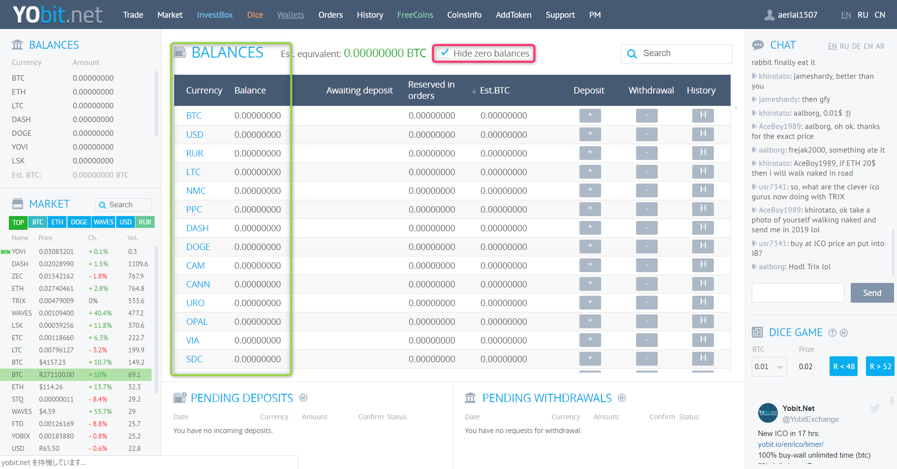 Diceとは、YoBitの取引方法の一つで簡単にいうと「サイコロゲーム」です。複数のサイコロを振って合計数が48より小さいか、52より大きいかを当てます。48-52が出たらユーザーの負けになります。