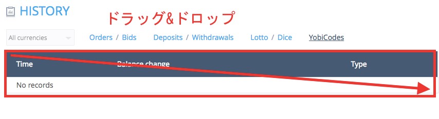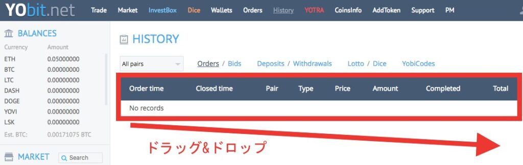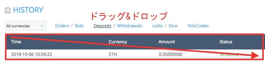 「Deposits」「Withdraws」をクリックします。そうすると「Deposits」「Withdraws」の取引履歴が表示されるので、「Time」から「Status」までをドラッグ&ドロップしてください。