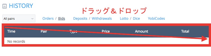 「Bids」をクリックします。そうすると「Bids」の取引履歴が表示されるので、「Time」から「Total」までをドラッグ&ドロップしてください。
