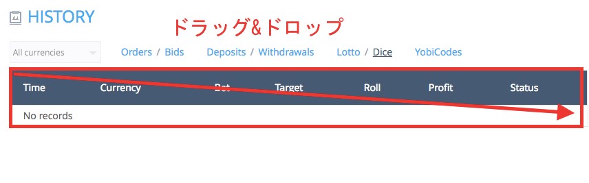 「Dice」をクリックします。そうすると「Dice」の取引履歴が表示されるので、「Time」から「Status」までをドラッグ&ドロップしてください。