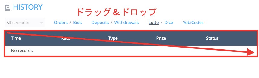 「Lotto」をクリックします。そうすると「Lotto」の取引履歴が表示されるので、「Time」から「Status」までをドラッグ&ドロップしてください。