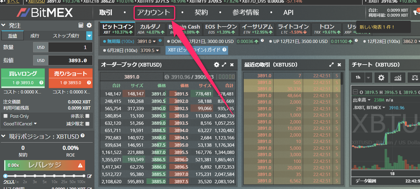 取引所にログインして、ページ上部の「アカウント」をクリックしてください。