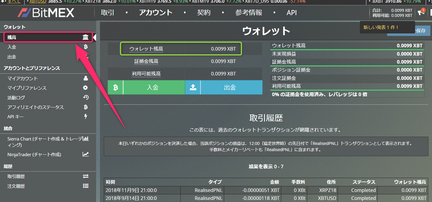 - BitMEXにログインしたら、画面右上のアカウントをウォレットマークをクリックします。