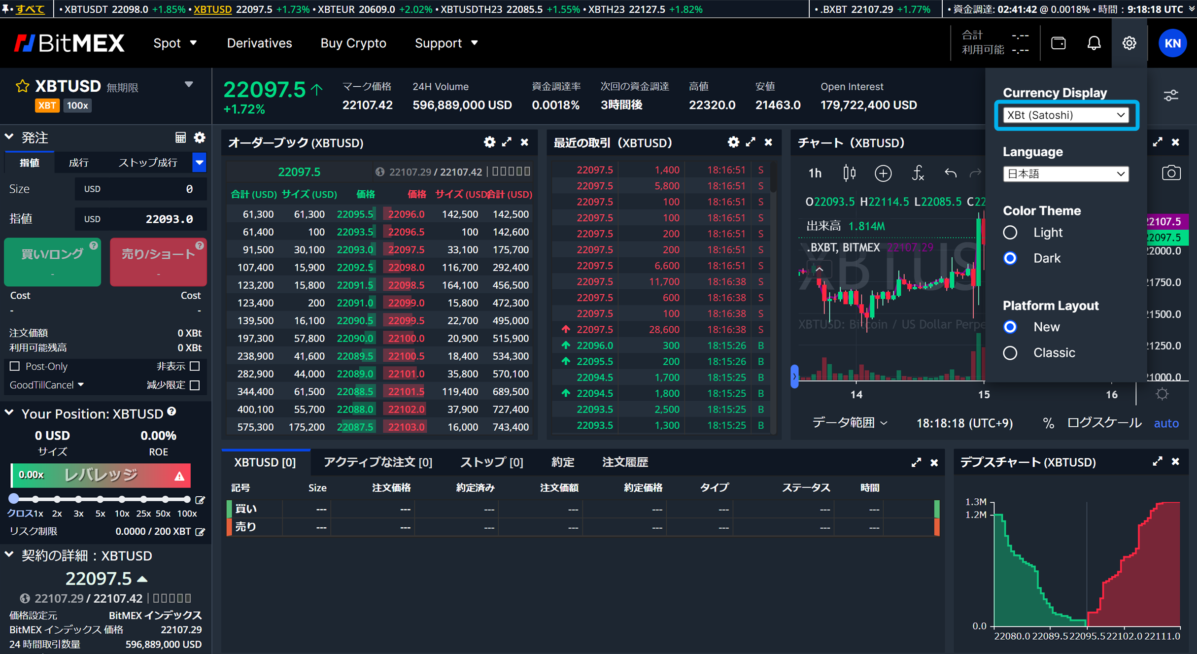 BitMEXにログインしたら、画面右上のアカウントを歯車マークをクリックし、「通貨表示」をクリックし、「XBt(Satoshi)」を選択します。