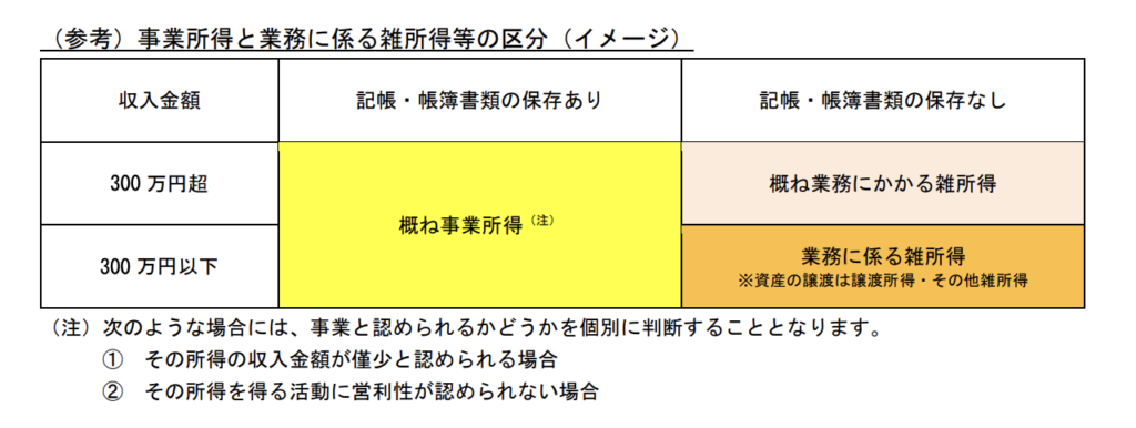 また、記帳・帳簿書類を保存していない場合は、基本的に雑所得の扱いになります。